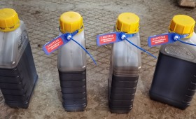 По итогу осмотра произведен отбор проб смазывающей жидкости (масла) из картера двигателя. Для этого слит некоторый объем масла, после чего произведено наполнение тары. Всего отобрано четыре емкости по 1 литру каждая.